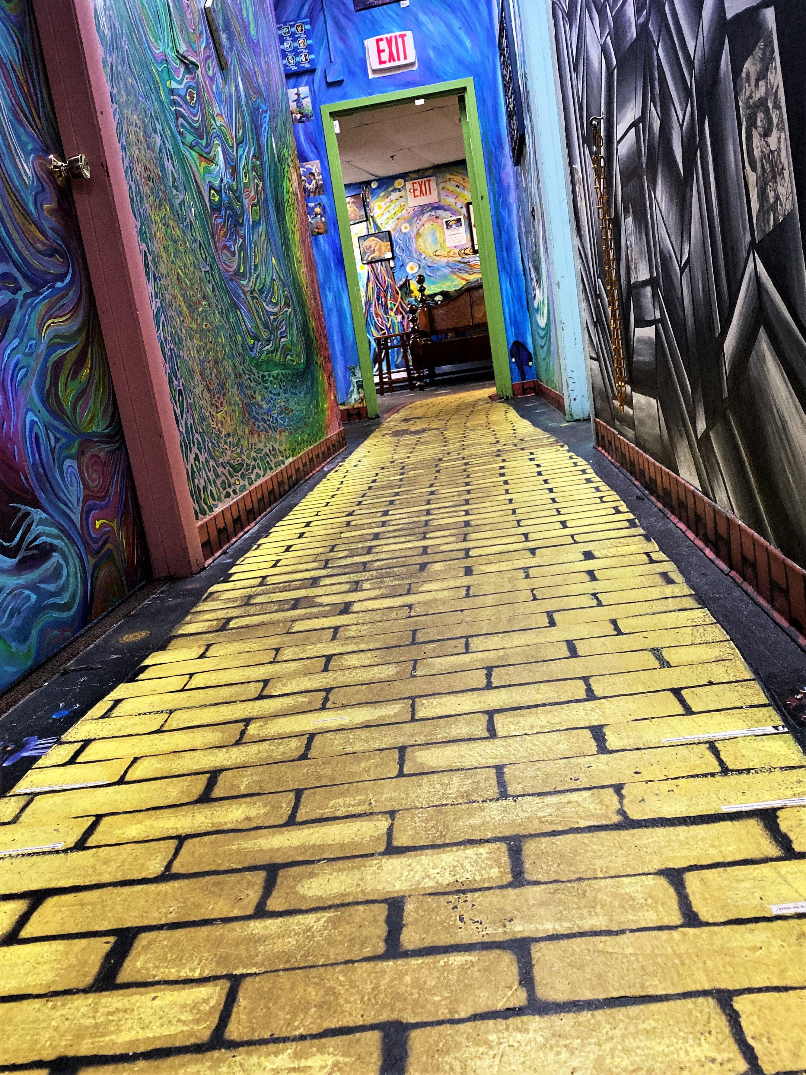 There’s also a yellow brick road painted on the floor, winding its way to the back of the restaurant, which is a maze of Jimi Hendrix-invoking, groovy-baby, Star Wars, painted hallways and rooms.