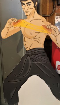 Anyway, inside Day-Of-The-Dead skulls and masks greet patrons at the door, along with a shirtless Bruce Lee (oh, behave, it’s just a cutout). He means business as he pulls apart a grilled cheese sandwich while sporting a sassy, come-hither expression suggesting that if you want it, you’re going to have to fight him for it.