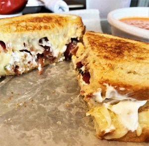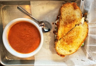 The menu features a variety of grilled cheese sandwiches ranging from “Fun” to “Fancy, and you can order any of them with an accompanying bowl of Whey Station(ary)’s thick, tomato bisque.